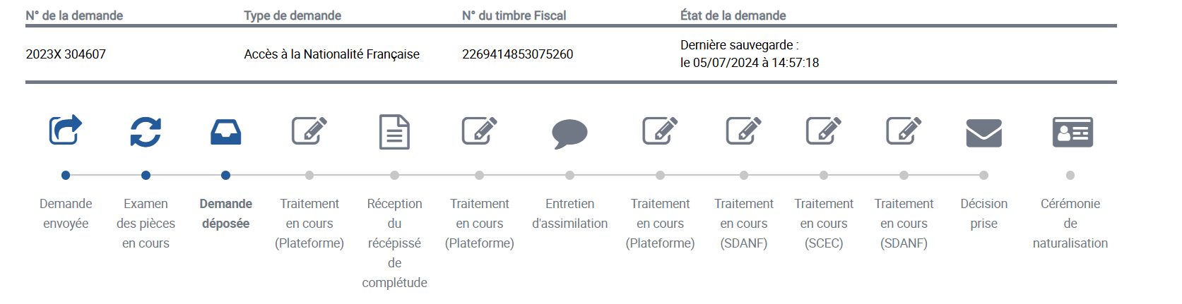 Je me permets de vous écrire concernant ma demande de naturalisation par décret déposée en novembre 2023, sous le numéro 2023X 304607 . À ce jour, le statut de ma demande sur la plateforme ANEF est toujours indiqué comme « Demande déposée », et ce, depuis plus de 18 mois.